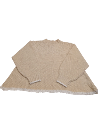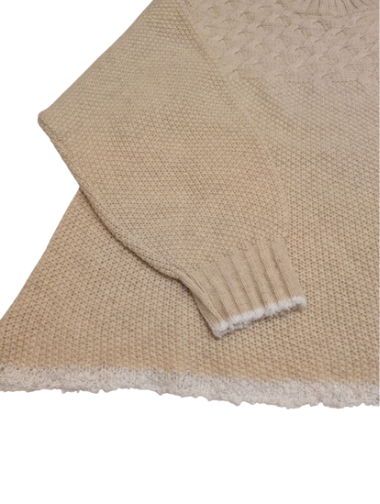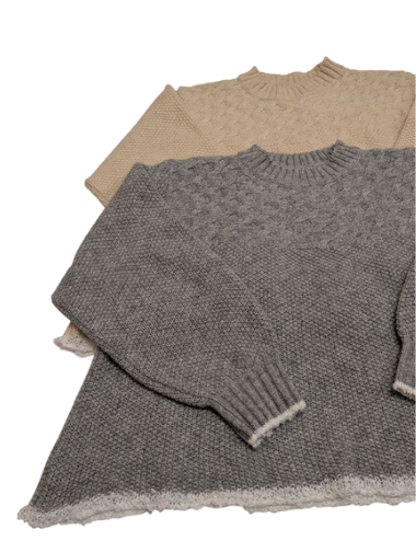 ニットの上部がバスケット編みになっていたり袖口や裾に白い糸で縁取りがされていたりと可愛い仕上がりに。